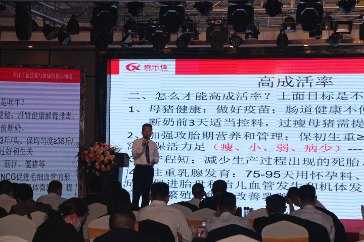李华总监从系统营养、高成活率、提高猪免疫力、如何选好料、教槽料使用方法等方面进行了详细阐述,提出“乳猪健康度高、免疫力强、均匀度好、快长不拉稀”,前提是母猪健康度+奶水数量质量+管理+教槽料;喜乐佳集团从优选原料、精准配方、完善工艺、严格生物防控、调控有益菌群、保护肠道结构和功能完整等系统的全面的解决方案入手,建立113体系、261模式等,核心就是“整肠抗炎,保肝利胆”,把养活猪和养好猪结合起来,同时充分挖掘猪的繁殖和生长潜能
